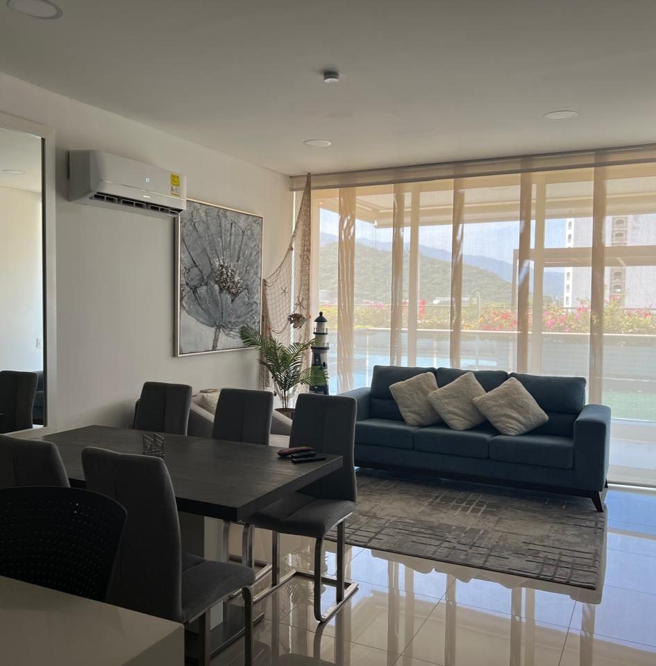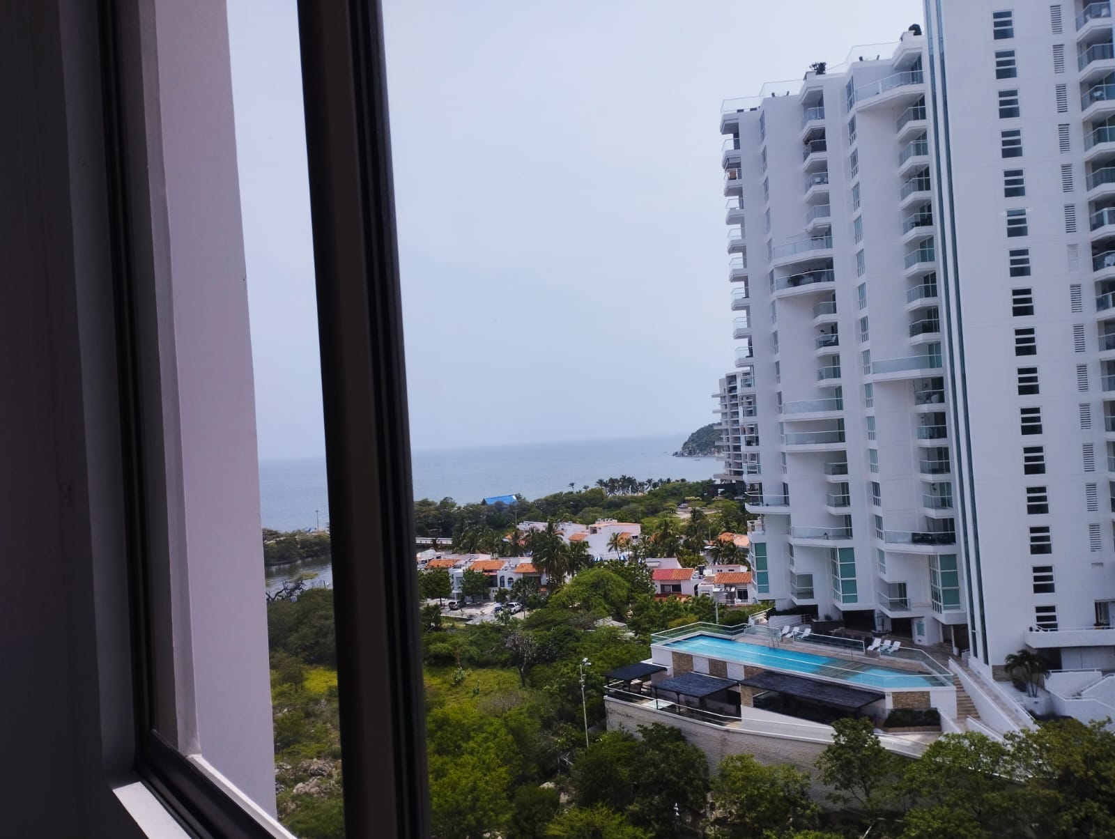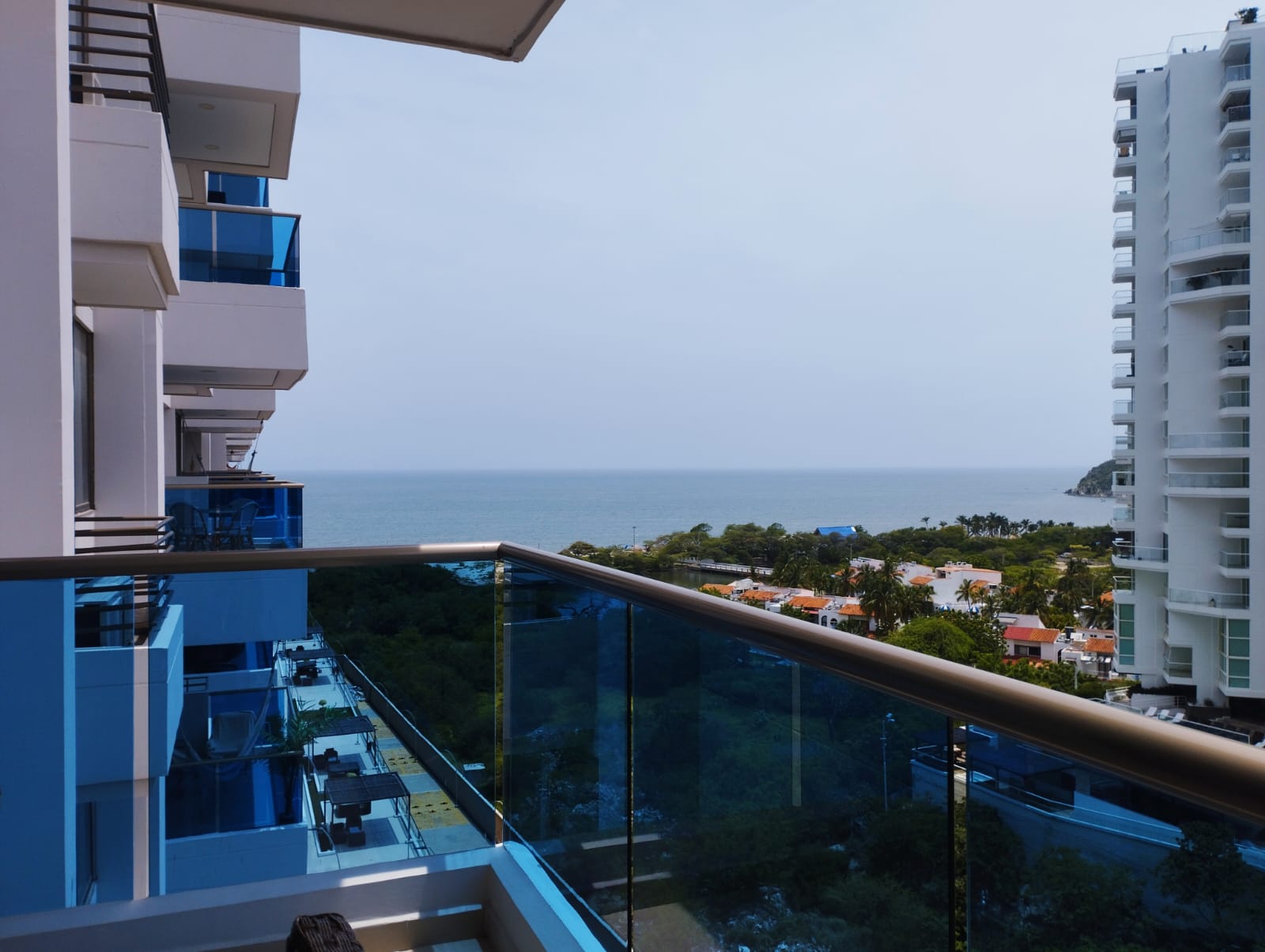 Apartamento con excelente vista desde piso 9, consta de 3 habitaciones con aire acondicionado, 2 baños, sala, comedor con aire acondicionado, balcón con vista al mar, agua caliente, cocina abierta con comedor auxiliar, nevecon,vajilla e implementos para cocinar. Las habitaciones tienen toda la lencería como sabanas almohadas, cobertores, toallas entre otros. El apartamento cuenta con servicio de Internet WiFi, estación de trabajo y 2 SmarTV , cerradura inteligente y parqueadero privado.