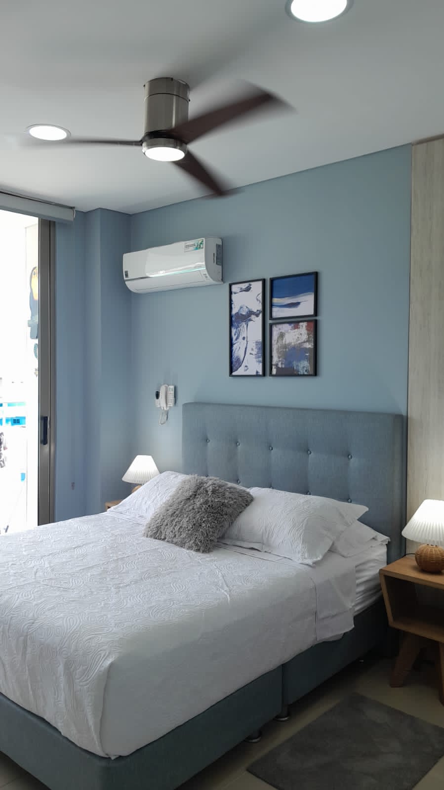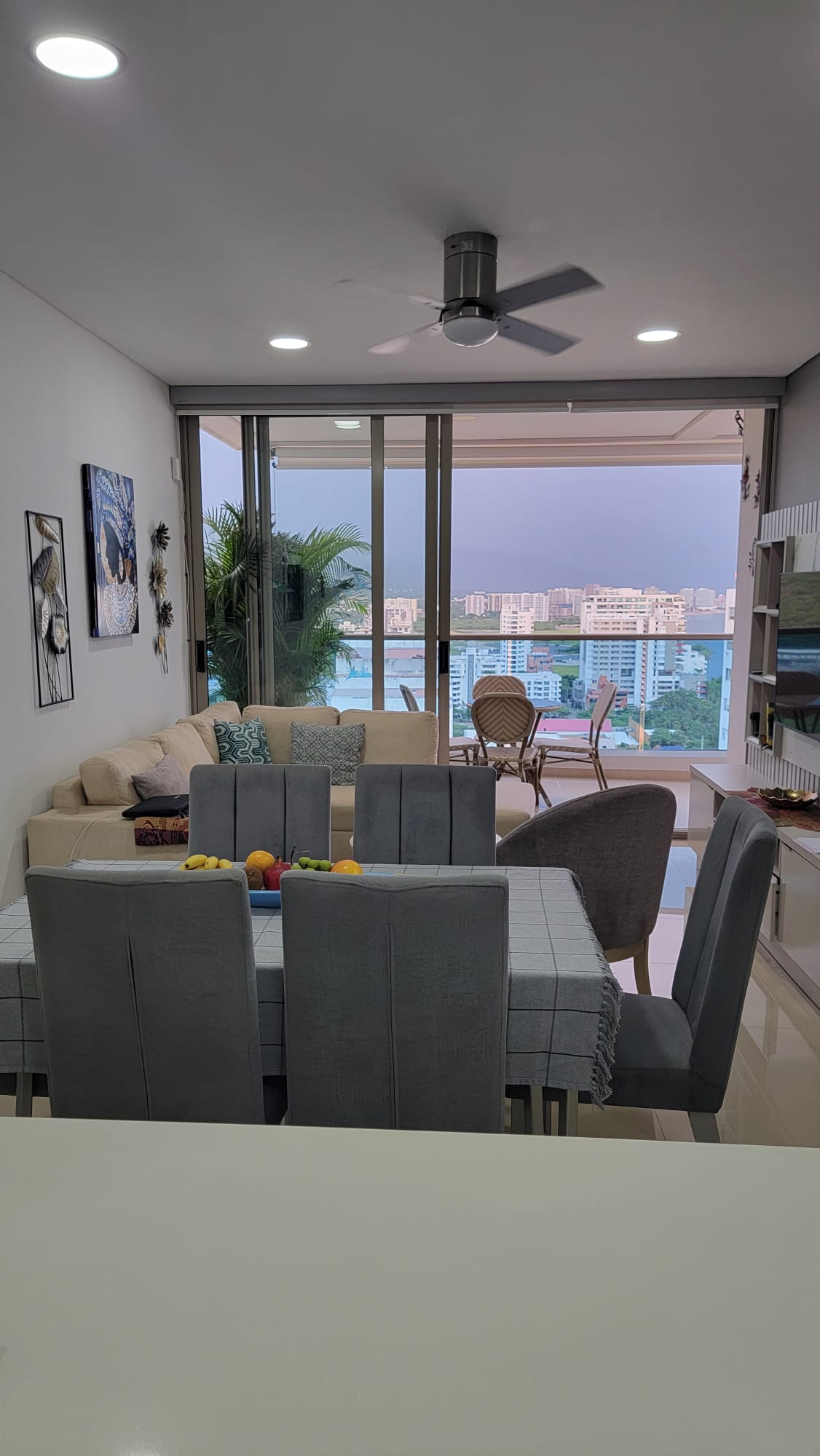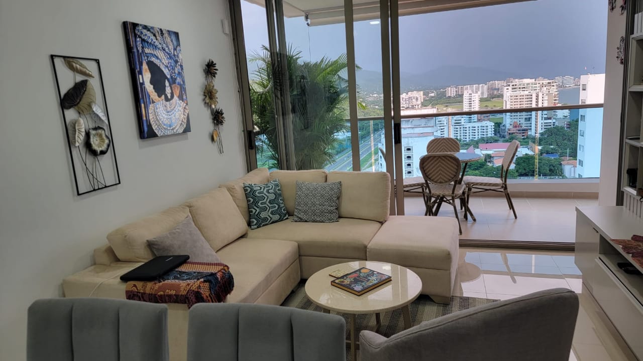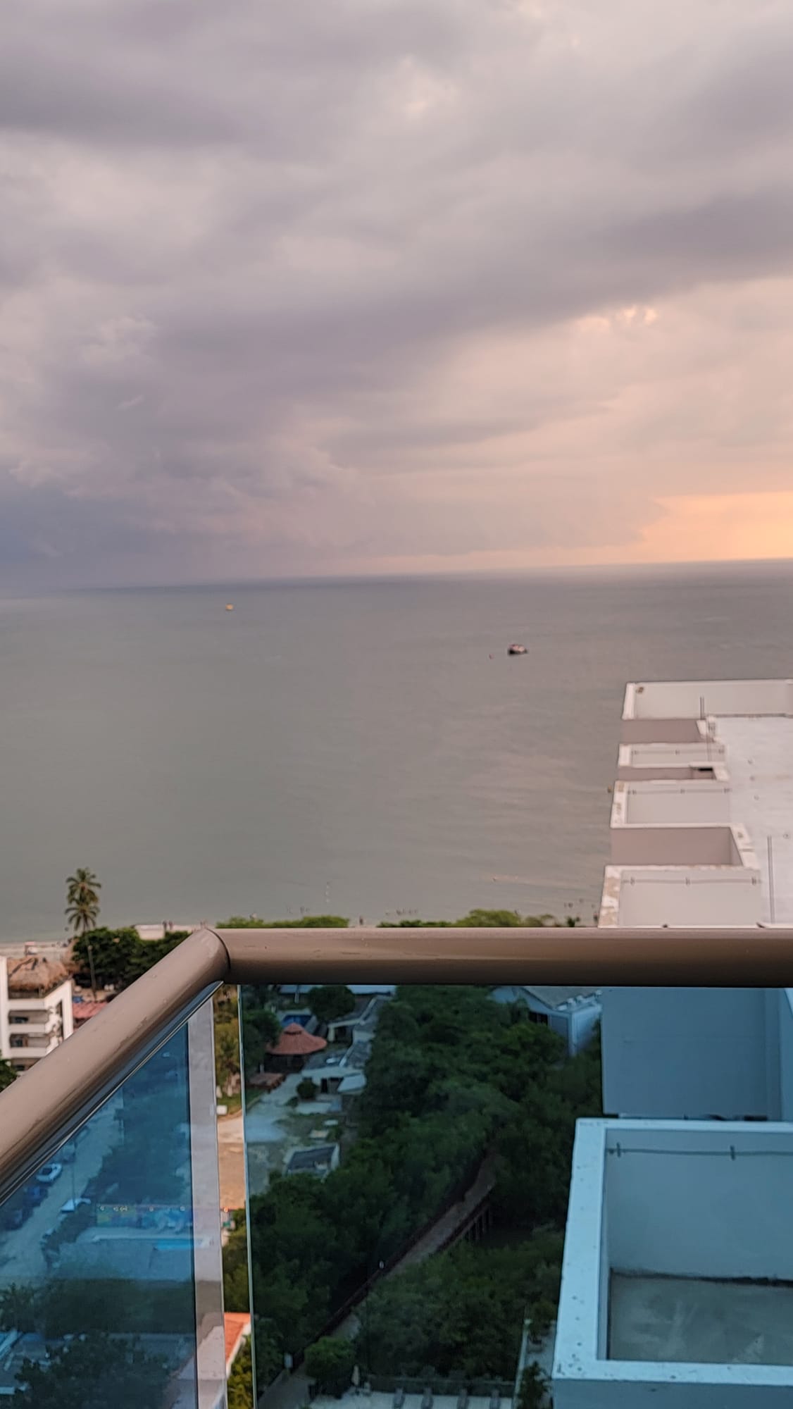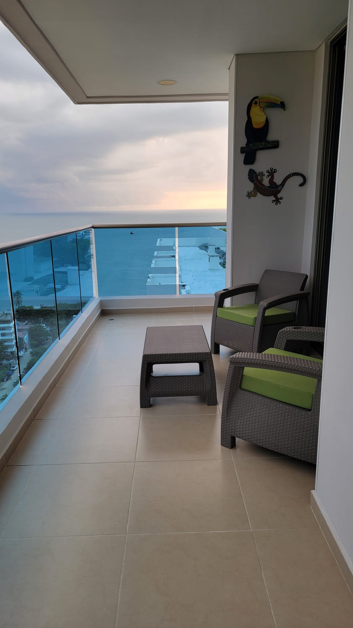 Esquinero, con excelente vista al mar desde piso 18, consta de 3 habitaciones con aire acondicionado, 2 baños, sala, comedor con aire acondicionado, balcón con vista frente al mar y BBQ, agua caliente, cocina abierta con comedor auxiliar, lavadora, secadora, nevecón con dispensador de hielo y agua, también la cocina cuenta con licuadora, cafetera, vajilla e implementos para cocinar. Las habitaciones tienen toda la lencería como sabanas almohadas, cobertores, toallas entre otros. El apartamento cuenta con servicio de Internet WiFi, estación de trabajo, 3 Smartv , cerradura inteligente y parqueadero privado.