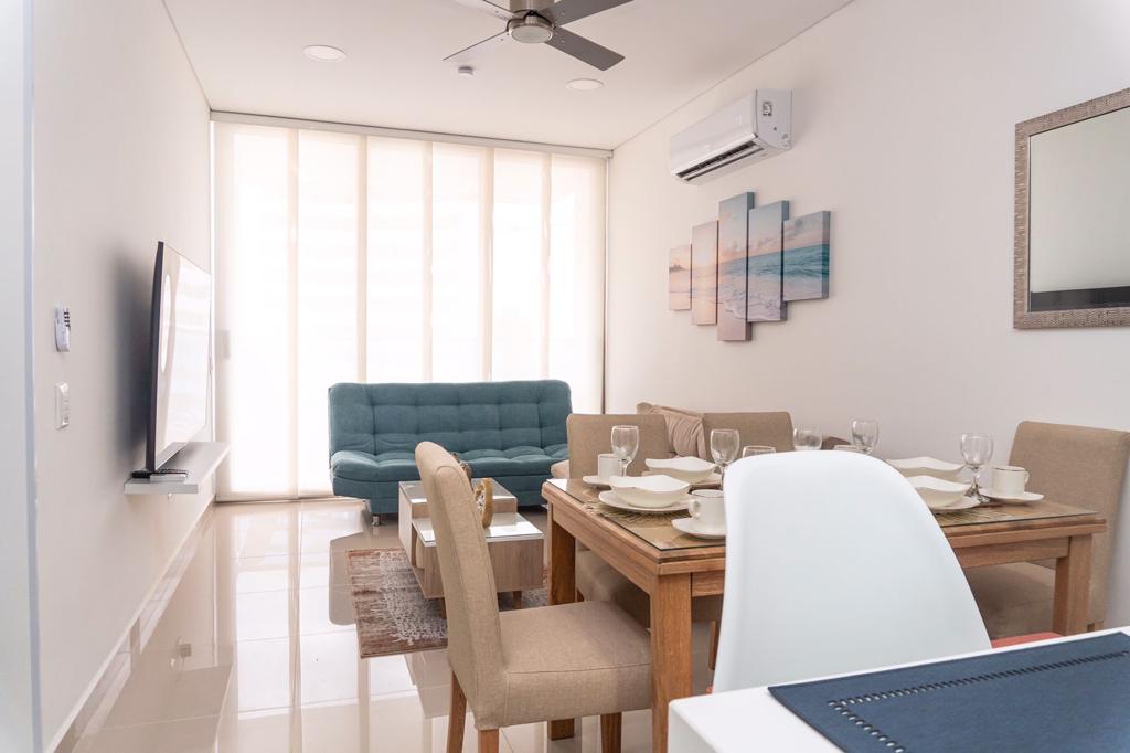 Lindo apartamento completo con vista al mar en piso 10. Consta de 2 habitaciones con aire acondicionado, 2 baños, sala- Comedor, balcón con vista al mar, agua caliente, cocina abierta con comedor auxiliar, patio de ropas, nevera, también la cocina cuenta con licuadora, cafetera, vajilla e implementos para cocinar. Las habitaciones tienen toda la lencería como sabanas almohadas, cobertores, toallas entre otros. El apartamento cuenta con servicio de Internet WiFi, Smartv y parqueadero privado.2 habitaciones