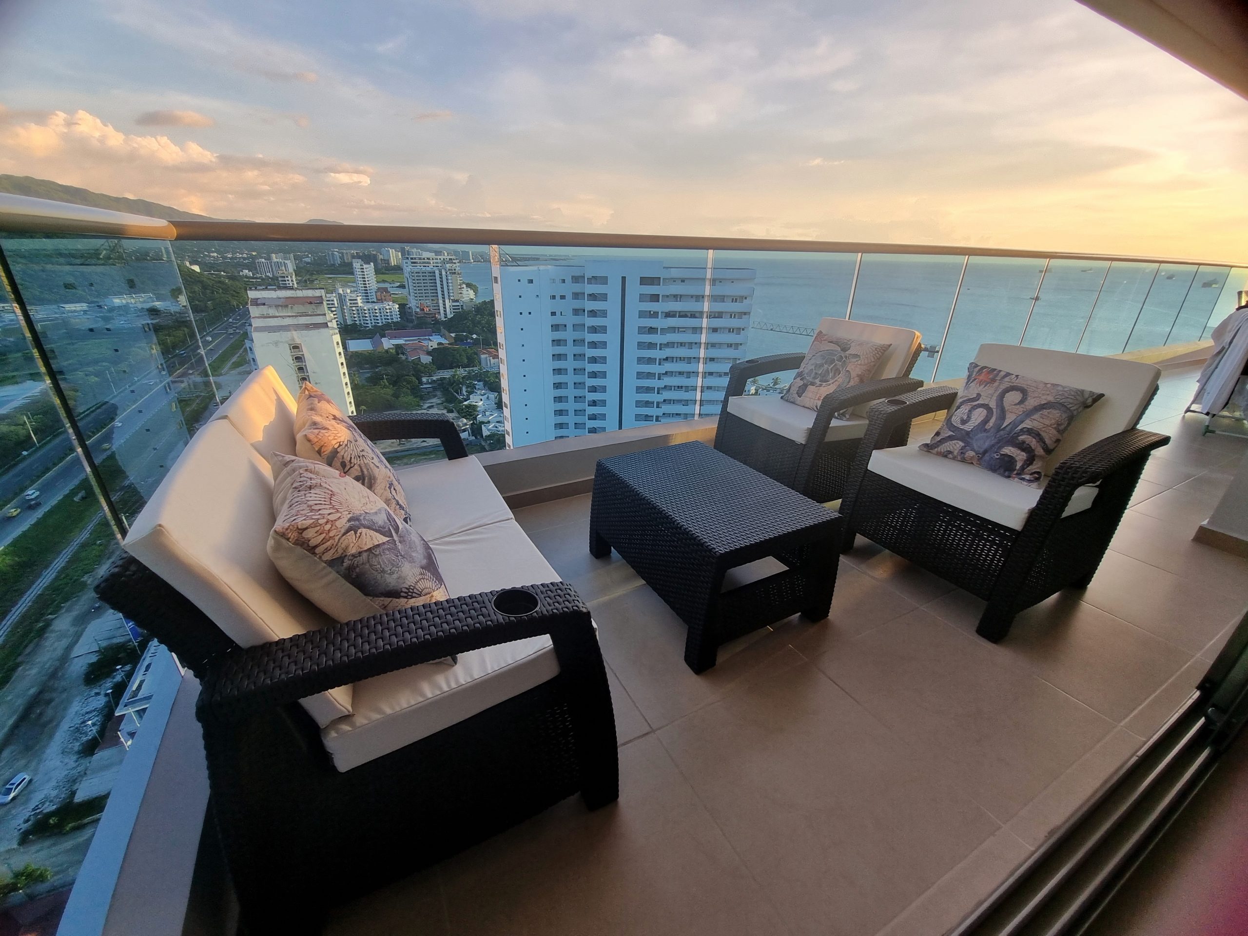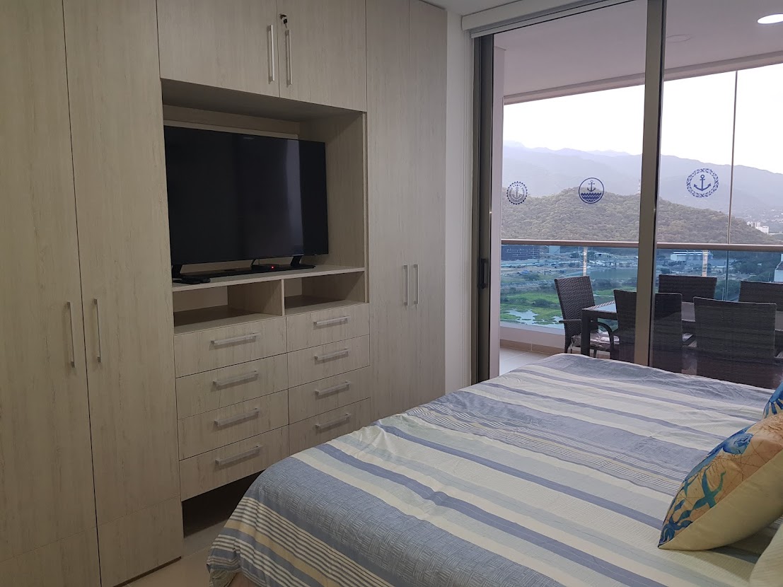 Penthouse Esquinero,105 metros, con excelente vista al mar desde piso 19, consta de 3 habitaciones con aire acondicionado, 2 baños, sala, comedor con aire acondicionado, balcón con vista frente al mar y BBQ, agua caliente, cocina abierta con comedor auxiliar, lavadora, secadora, nevecón con dispensador de hielo y agua, también la cocina cuenta con licuadora, cafetera, horno microondas vajilla e implementos para cocinar. Las habitaciones tienen toda la lencería como sabanas almohadas, cobertores, toallas entre otros. El apartamento cuenta con servicio de Internet WiFi, estación de trabajo, 3 Smartv , cerradura inteligente y parqueadero privado.
