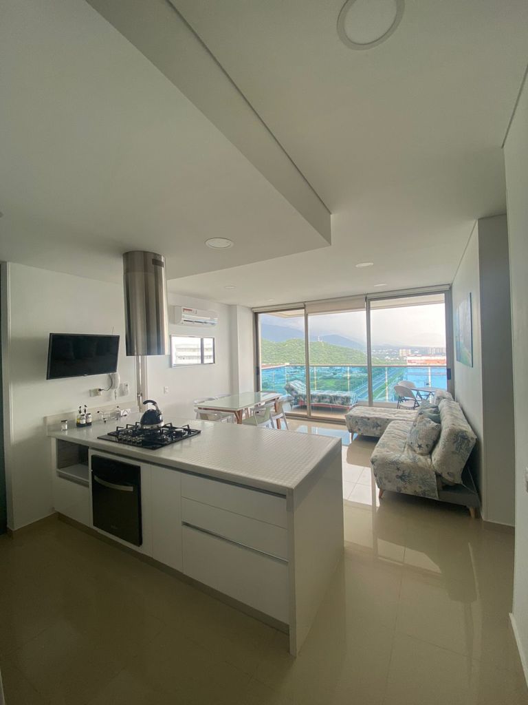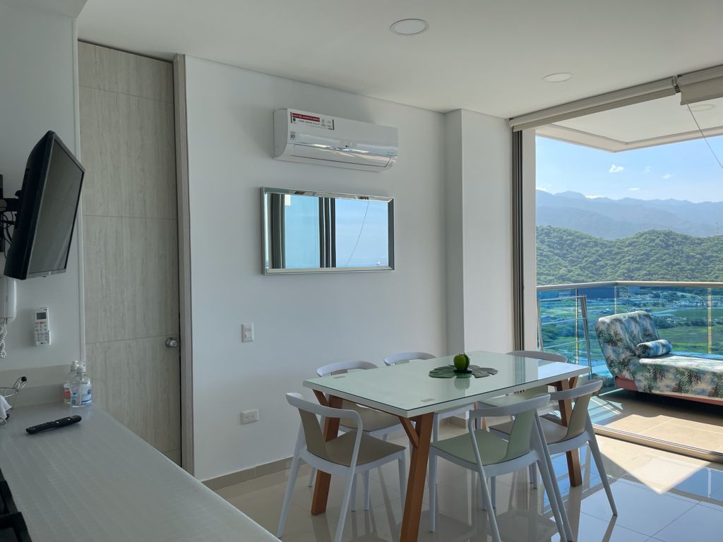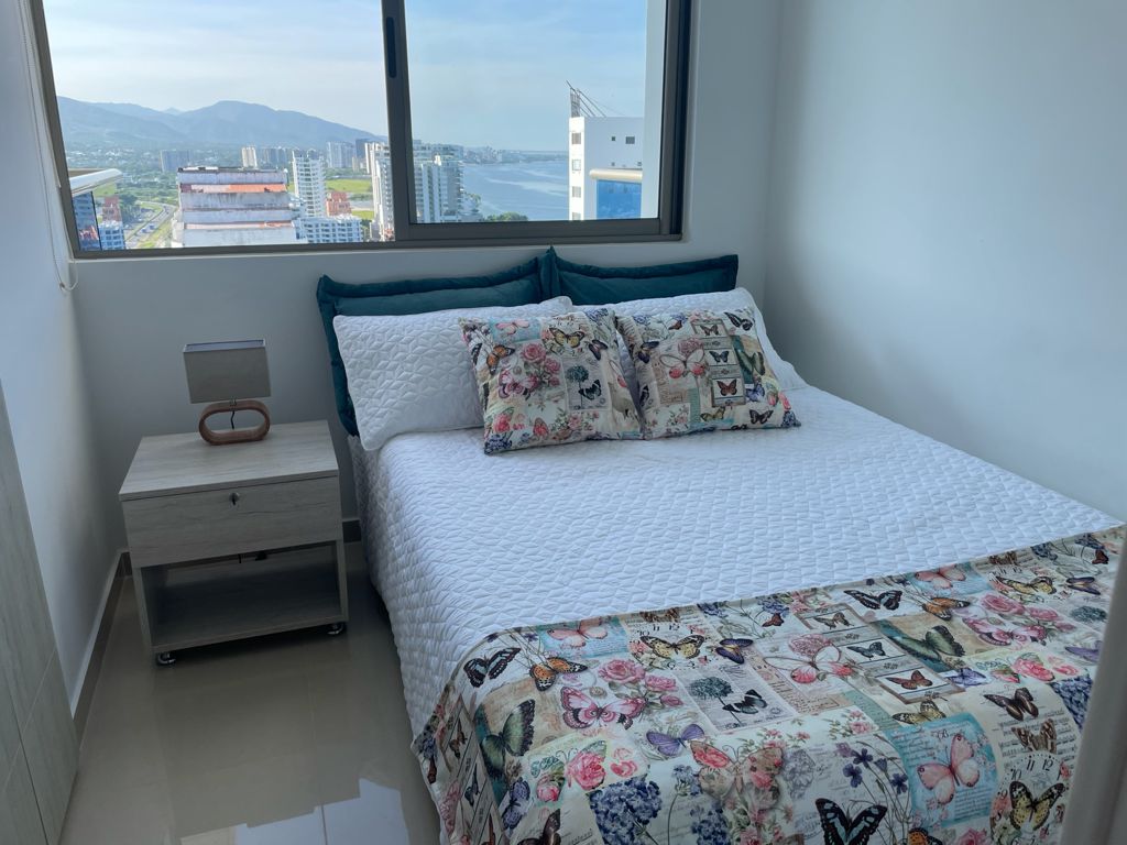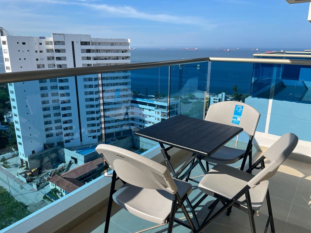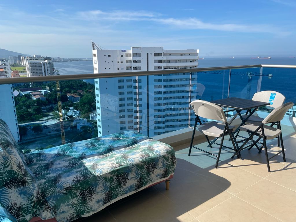 Hermoso Apartamento con excelente vista al mar desde piso 17, consta de 3 habitaciones con aire acondicionado, 2 baños, sala, comedor con aire acondicionado, balcón con vista al mar, agua caliente, cocina abierta con comedor auxiliar, lavadora, secadora, nevecon con dispensador de hielo y agua, también la cocina cuenta con licuadora, picadora , horno microondas, cafetera, sandwichera, vajilla e implementos para cocinar. Las habitaciones tienen toda la lencería como sabanas almohadas, cobertores, toallas entre otros. El apartamento cuenta con servicio de Internet WiFi, estación de trabajo, 4 Smartv , cerradura inteligente y parqueadero privado.